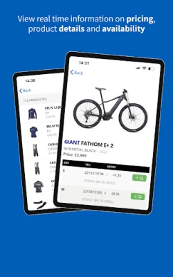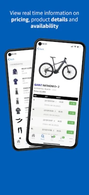 1. Find products by scanning a bar code or by entering a name or article number. 2. Handle warranty claims. 3. Get real-time pricing, product details, and availability information. 4. Access real-time sales- and balance statistics. 5. Place orders 24/7. 6. Keep track of backorders. 7. Get detailed bike fitting instructions, based on the customers' body measurements.