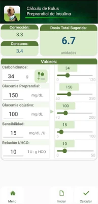 Calcula de forma rápida y sencilla el bolus preprandial de insulina de acuerdo a los niveles de glucemia, consumo de carbohidratos, sensibilidad y relación insulina/HCO.