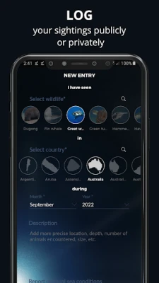 Keep track of your marine wildlife experiences on your own personal map. Add your sightings by selecting an animal, time of year and country. Take the opportunity to report on the environmental situation at the dive site (e.g. marine debris, corals in distress, etc.).