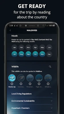 Once you select a desired country, the Country Page shows the types and locations of other marine life likely to be spotted in that country. The page also includes valuable information like local diving regulations, environmental sustainability recommendations, a list of hyperbaric chambers and more.